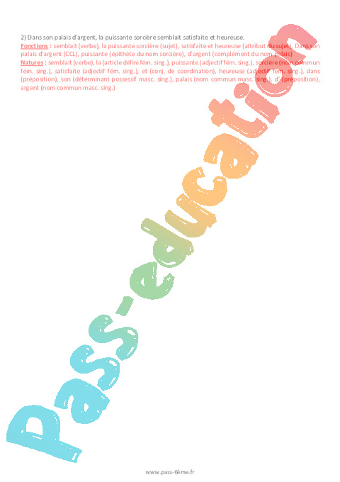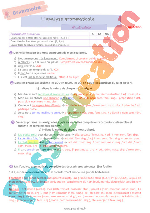 Évaluation de 6ème avec la correction sur l’analyse grammaticale.