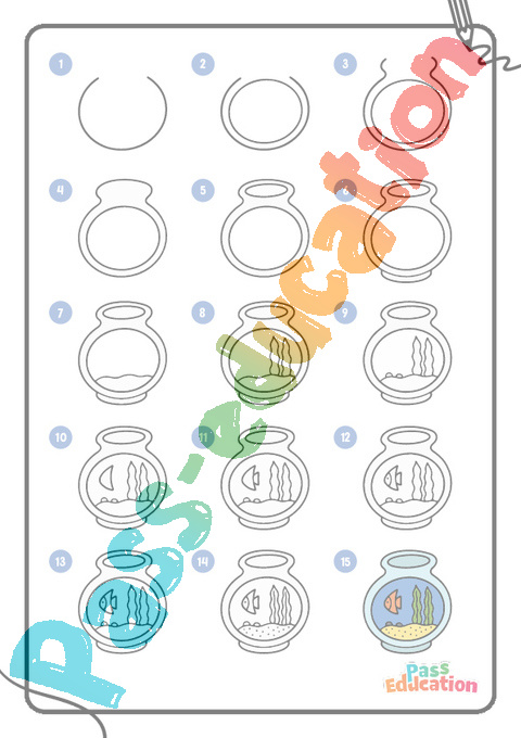 Dessins à étapes sur le bocal à poissons en maternelle pour la Maternelle 2 Primaire 1, 2 .