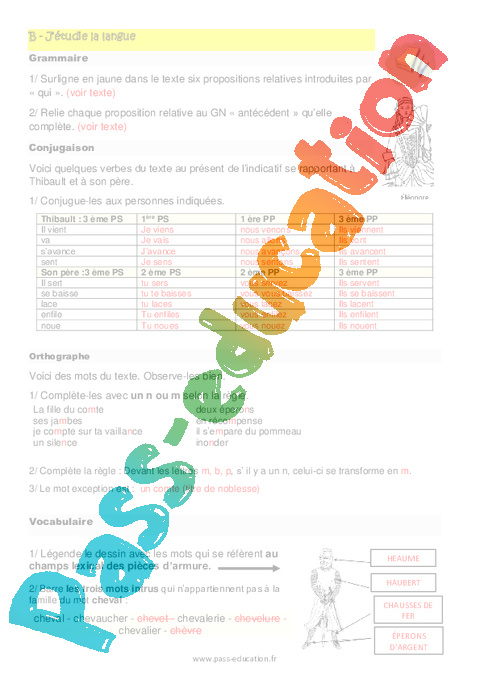 1- Légende le dessin avec les mots qui se réfèrent au champs lexical des pièces d’armure.