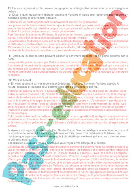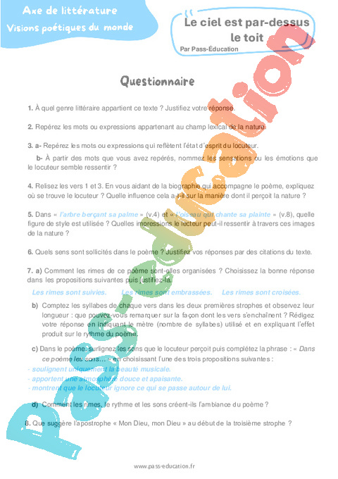 Correction Questionnaire Le ciel est par-dessus le toit (Paul Verlaine) : Secondaire 3 pdf