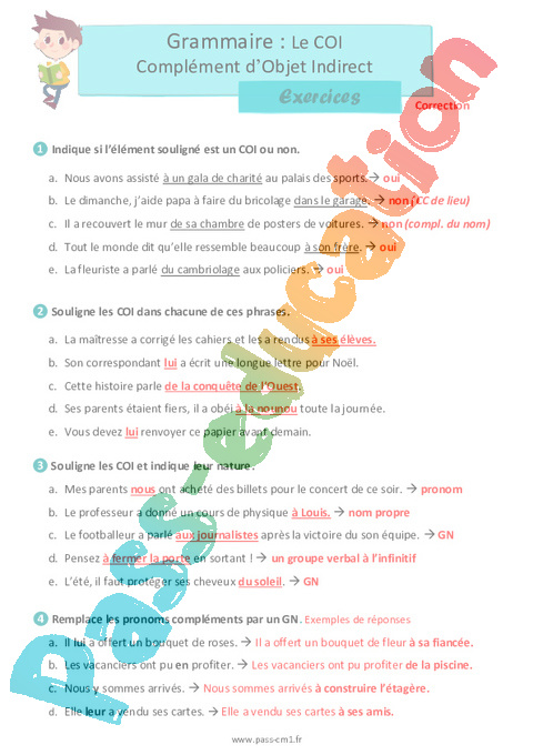 Correction Le COI complément d’objet indirect – Exercices de grammaire pour la Primaire 4 rtf