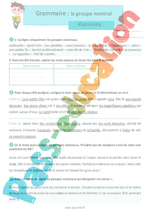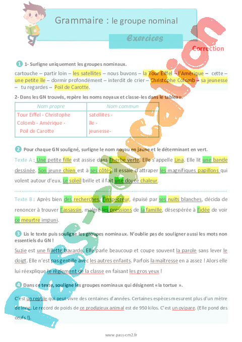 Exercices avec les corrigés en grammaire : Le groupe nominal en Primaire 5 .