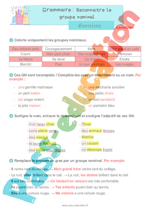 Exercices Correction : Primaire 2 Reconnaître le groupe nominal pdf