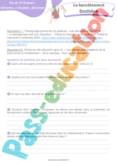 Synthèse Le harcèlement : Secondaire 2 pdf