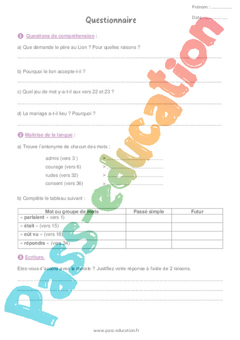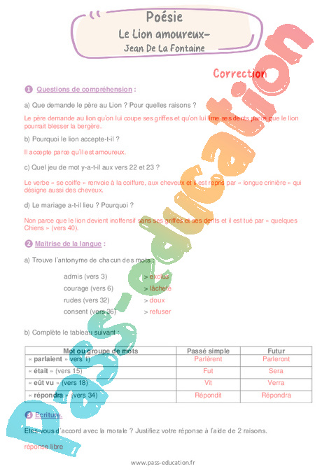 Correction Lecture poésie + Questionnaire Le Lion amoureux : Primaire 6 rtf