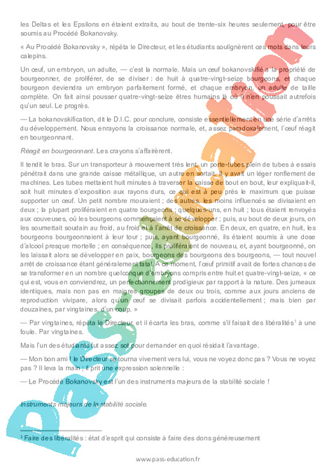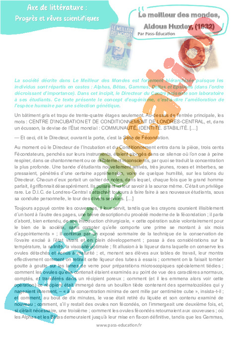 La société décrite dans Le Meilleur des Mondes est fortement hiérarchisée puisque les individus sont répartis en castes : Alphas, Bêtas, Gammas, Deltas et Epsilons (dans l’ordre décroissant d’importance). Dans cet incipit, le Directeur du Centre présente son laboratoire à ses étudiants. Ce texte présente le concept d’eugénisme, c’est-à-dire l’amélioration de l’espèce humaine par une sélection génétique.
