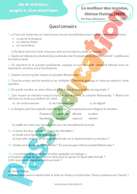 Questionnaire Le meilleur des mondes, Aldous Huxley, (1932) : Secondaire 3 pdf