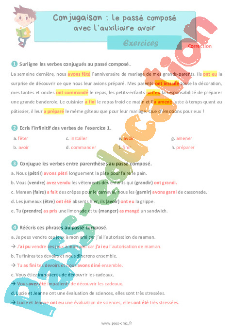 Exercices Correction : Primaire 4 Le passé composé avec l’auxiliaire avoir pdf