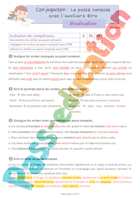 Evaluation Correction : Primaire 4 Le passé composé avec l’auxiliaire être pdf