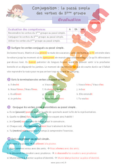 Evaluation Correction : Primaire 4 le passé simple des verbes du 3ème groupe pdf