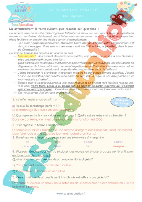 Correction Le plombier italien : Primaire 6 Secondaire 1 – Littérature – T’as la réf pdf