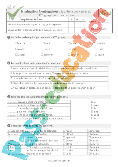 Evaluation Conjugaison : le présent des verbes du 3ème goupe en -ir, -oir et -dre