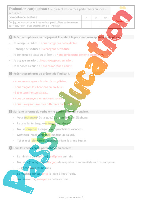 Evaluation Correction présent des verbes en -cer, -guer, -ger : Primaire 4 pdf