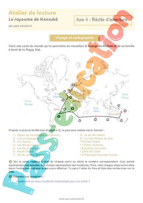 ❶ Sur la carte, replace à côté de chaque point ou étoile le numéro correspondant. (Les points représentent les escales. Les étoiles représentent les incidents). Puis, relie chaque étape entre elles dans l’ordre pour retracer le parcours effectué. Tu peux t’aider du livre et faire des recherches sur le web.