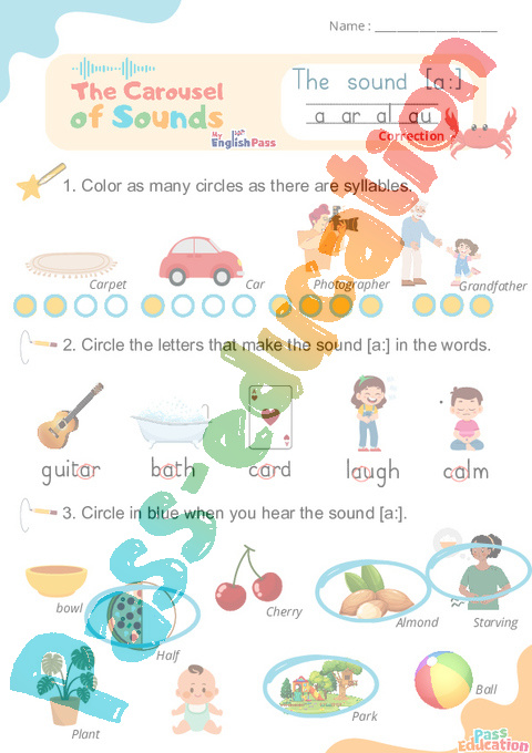 Correction Son [a] a ar al au – Phonologie anglaise – Carousel of Sounds – Fiche pdf