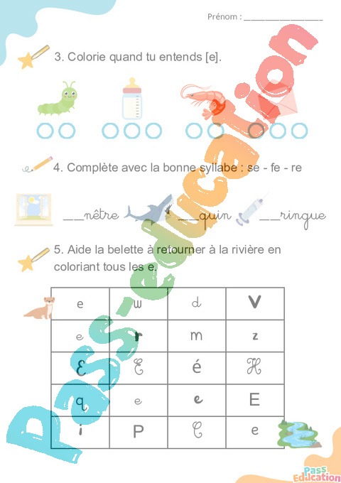 5. Aide la belette à retourner à la rivière en coloriant tous les e.