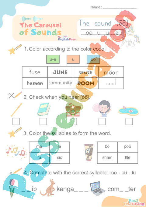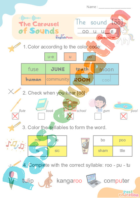 Correction [ōō] oo u u_e  – Phonologie anglaise – Carousel of Sounds – Fiche pdf