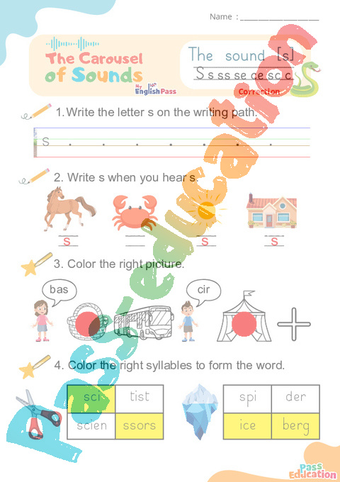 Correction Le son [s] s ss se ce – Phonologie anglaise – Carousel of Sounds – Fiche pdf