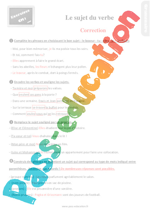 Exercices, révisions sur le sujet du verbe en Primaire 4 Correction pdf