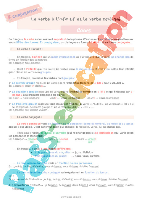 Cours de conjugaison pour la Primaire 6 sur le verbe à l’infinitif et le verbe conjugué.