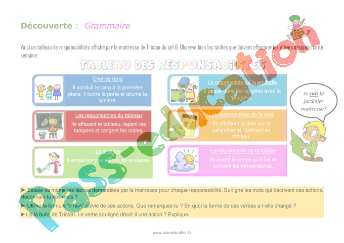 → Demander aux élèves d’observer la suite des responsabilités et de surligner les verbes (c’est à dire toutes les actions indiquées.).