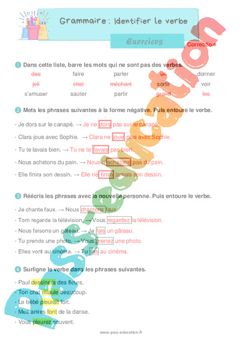 Exercices avec les corrections pour la Primaire 2 sur identifier le verbe.