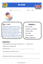 Lecture – Level 3 en anglais : « In bed » en Primaire 4, 5 Text : In bed “Today I don’t feel very well. I have a headache and feel tired. Mum checks my temperature. I have a high fever so she calls the doctor. One hour later, the doctor comes by and tells me to rest for a week. Next, Mum goes to the pharmacy to buy medicine. Berk, I don’t like this! I hope I will feel better soon!”…