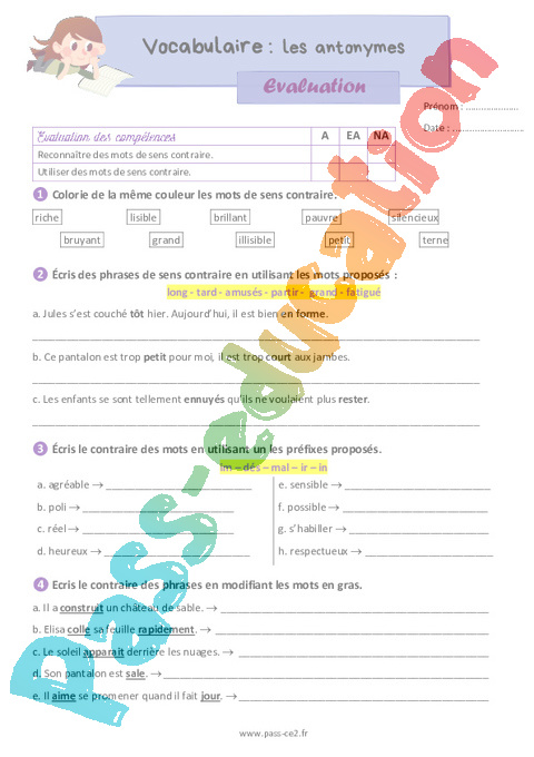 Evaluation : Primaire 3 Les antonymes pdf