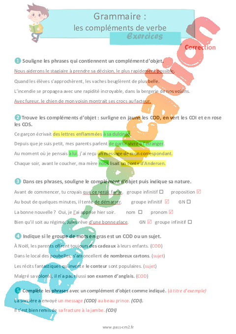 Correction Exercices Les compléments de verbe (COD, le COI): Primaire 5 pdf