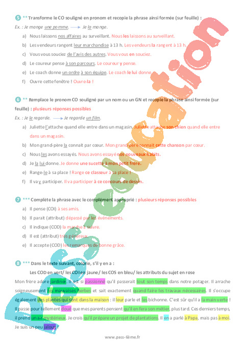 Les COD en vert/ les COI en jaune/ les COS en bleu/ les attributs du sujet en rose