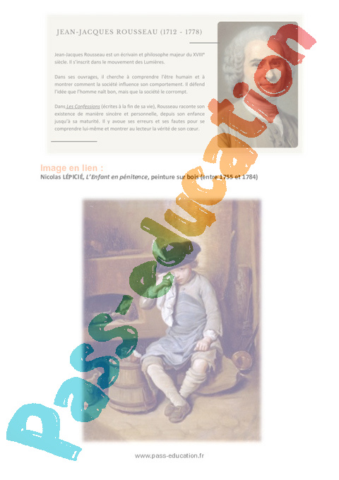 Jean-Jacques Rousseau est un écrivain et philosophe du XVIIIᵉ siècle. Dans Les Confessions, il raconte sa vie de manière très personnelle et inédite à l’époque. L’extrait présenté se situe dans son enfance, alors qu’il est apprenti chez un maître à Turin.