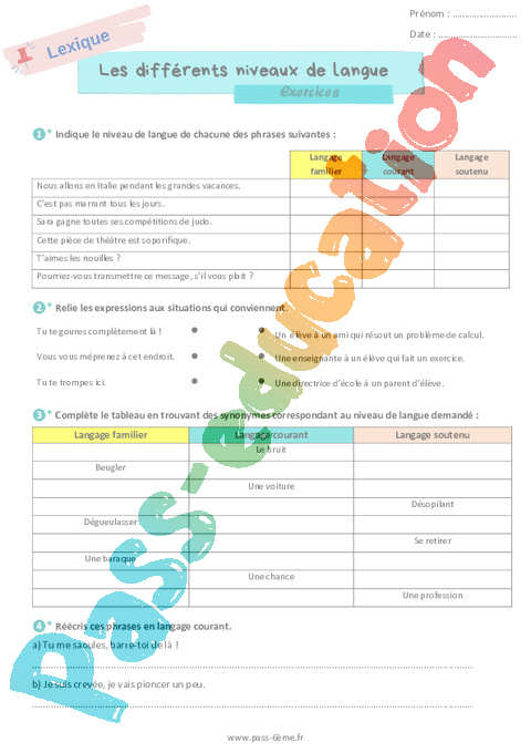 Exercices de vocabulaire avec la correction sur les différents niveaux de langue en 6ème.