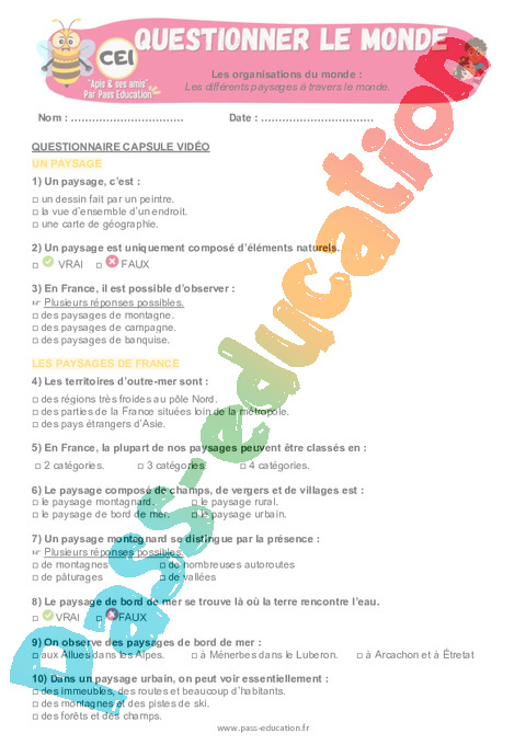3.1 Correction QCM capsule vidéo : Primaire 2 Les différents paysages à travers le monde rtf
