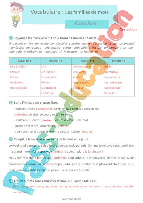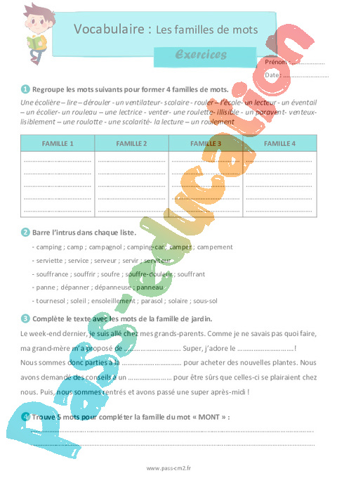 Une écolière – lire – dérouler – un ventilateur- scolaire – rouler – l’école- un lecteur – un éventail – un écolier- un rouleau – une lectrice – venter- une roulette- illisible – un paravent- venteux- lisiblement – une roulotte – une scolarité- la lecture – un roulement