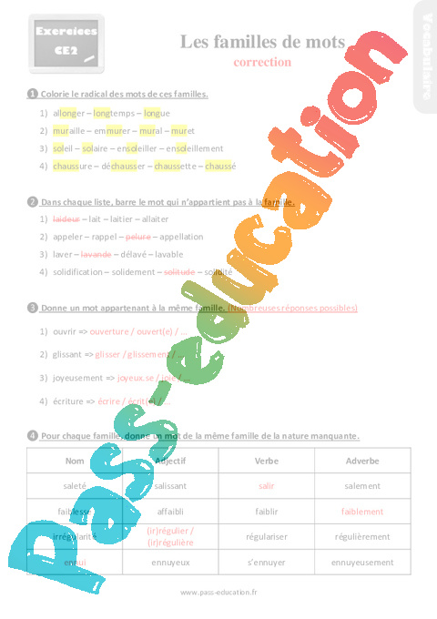 Exercices, révisions sur les familles de mots : Primaire 3 – Correction pdf