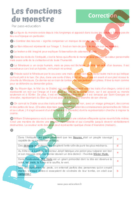 Les fonctions du monstre – Questionnaire Partie 1 Correction pdf