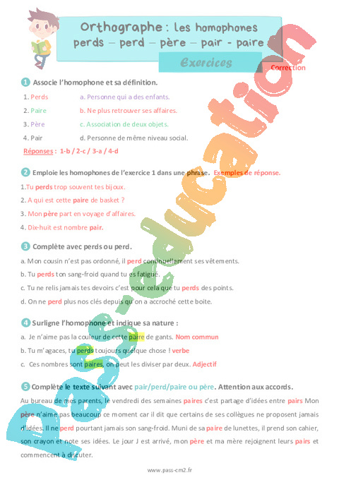 Exercices Correction : Primaire 5 Les homophones lexicaux perds – perd – père – pair – paire pdf