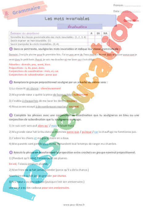 Évaluation de grammaire avec la correction sur les mots invariables en 6ème.