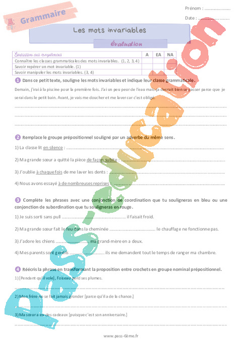 Evaluation 6ème Les mots invariables pdf