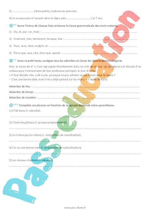 Exercices de grammaire avec la correction sur les mots invariables en 6ème.