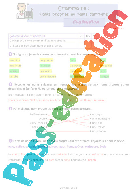 Correction Evaluation Les noms communs et noms propres : Primaire 2 pdf
