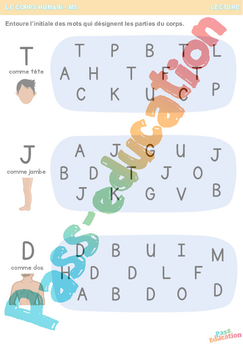 Entoure l’initiale des mots qui désignent les parties du corps.