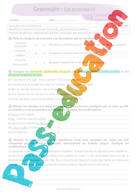Evaluation Les pronoms (1) : Secondaire 1 pdf