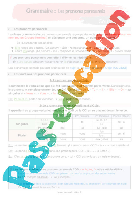 Cours sur les pronoms personnels en : Secondaire 1 .