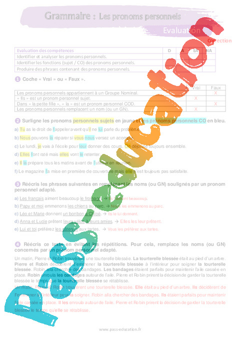 Correction Evaluation Les pronoms personnels : Secondaire 1 pdf