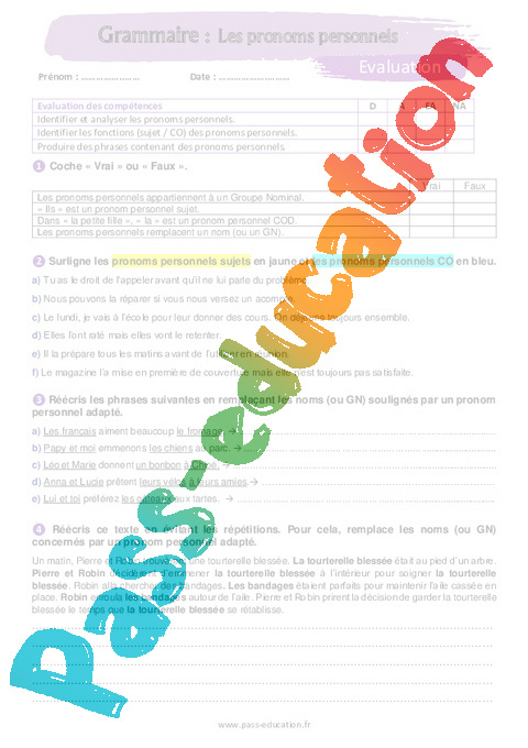 Evaluation Les pronoms personnels : Secondaire 1 rtf
