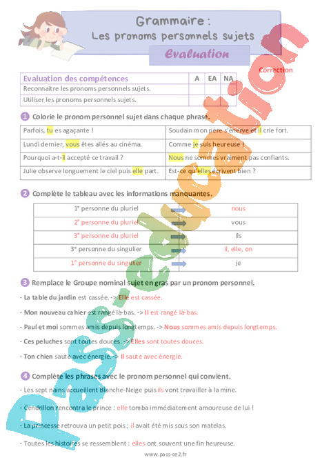 Correction Evaluation Les pronoms personnels sujet : Primaire 3 pdf