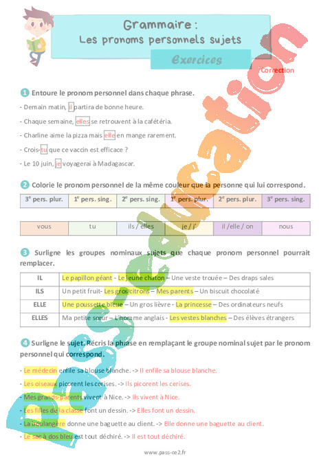 Correction Exercices Les pronoms personnels sujet : Primaire 3 pdf