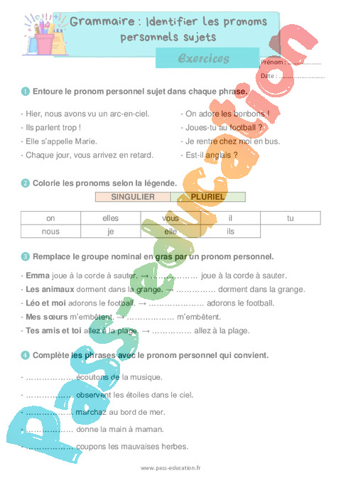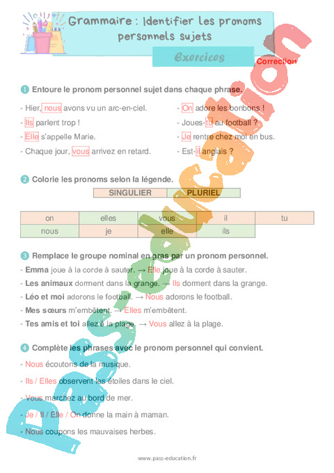 Exercices Correction : Primaire 2 Identifier les pronoms personnels sujets pdf