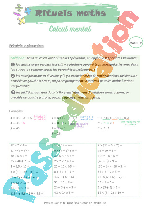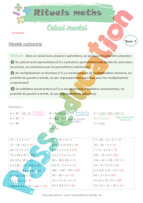 Rituels maths – calcul mental IEF : Secondaire 2 – correction pdf